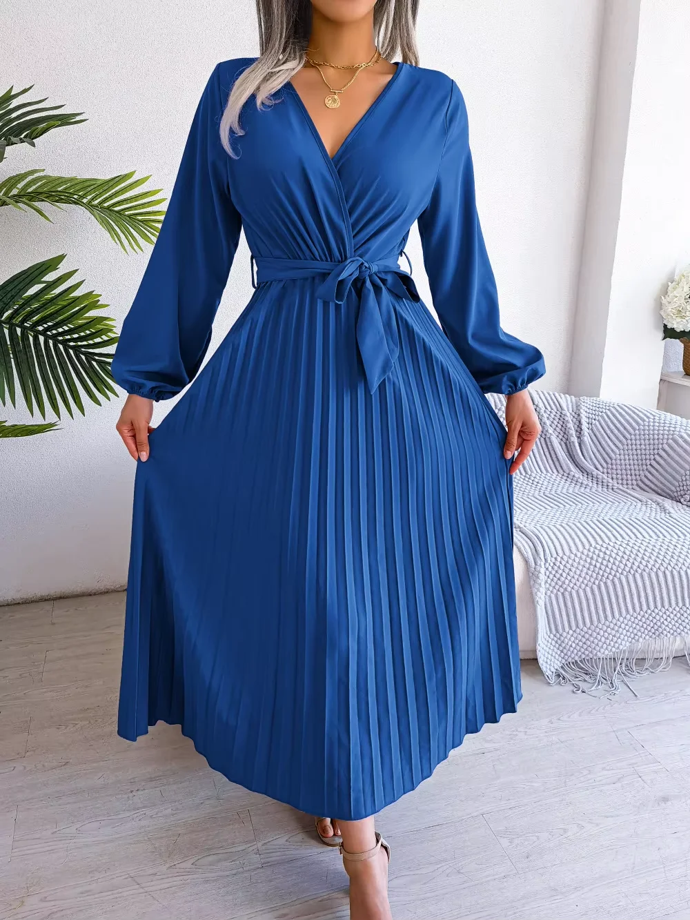 Europe's Women's Elegant Casual Long Sleeve Cross V-Neck Pleated Maxi Dress Sweet Style with Waist Strap-Solid Color